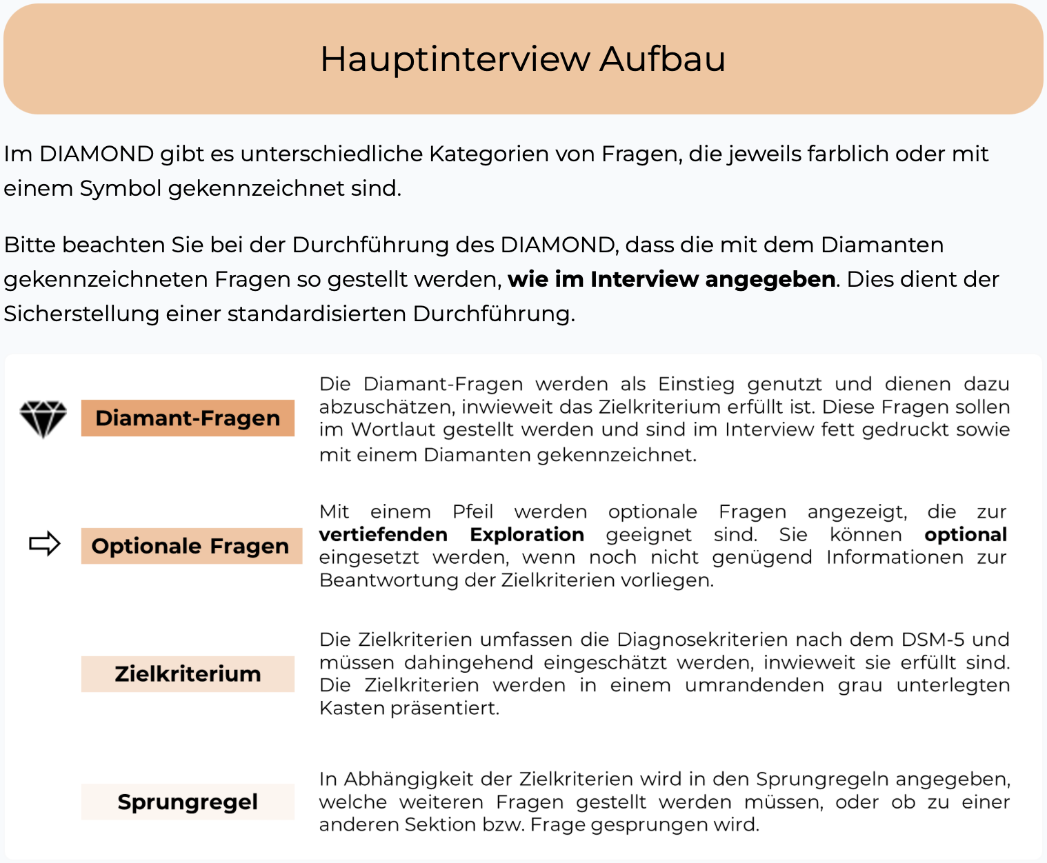 Das DIAMOND ist ein halbstrukturiertes Interview, welches zur Diagnostik von psychischen Störungen nach den DSM-5 Kriterien bei Erwachsenen ab 18 Jahren eingesetzt wird.